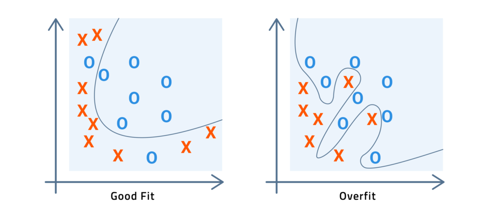 The large drop between the validation score and the holdout score indicates that something is very different between the validation and holdout datasets. When I examined the holdout dataset (the SARCOS test set), I found that every row in the test set was in the training data too. After some investigation, I discovered that the holdout dataset was built out of the training dataset. Of the 4,449 examples in the test set, 4,445 examples are present in the training set, too. The target leakage here is significant. By overfitting or memorizing the training dataset, it’s possible to get perfect results on the test set. Overfitting, a well-known issue in machine learning, is illustrated in the following figure. The test dataset should have used out-of-sample testing to prevent overfitting.